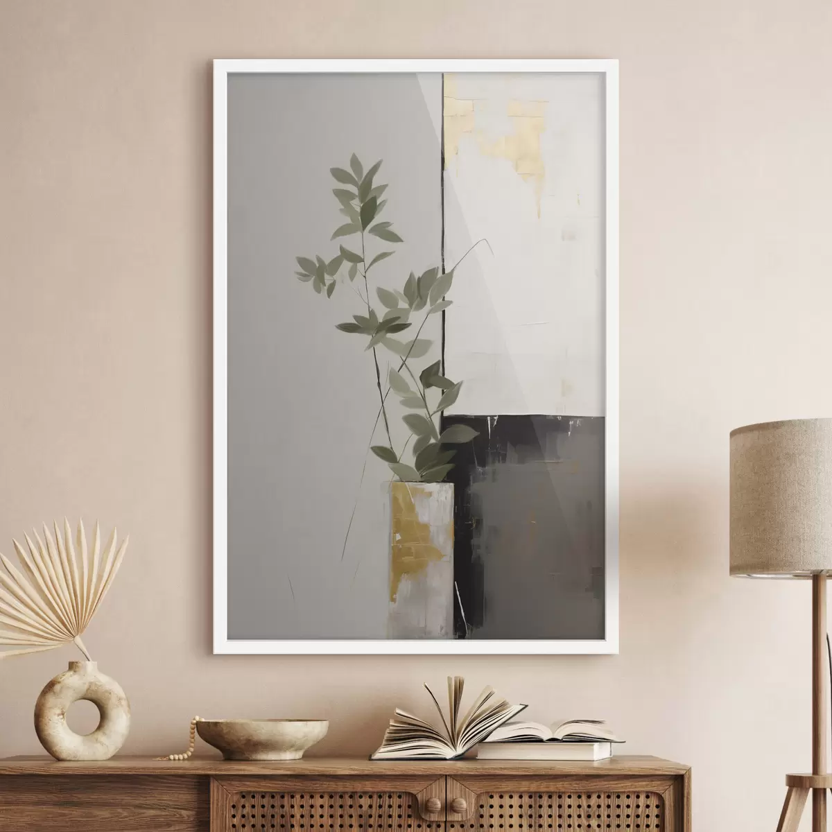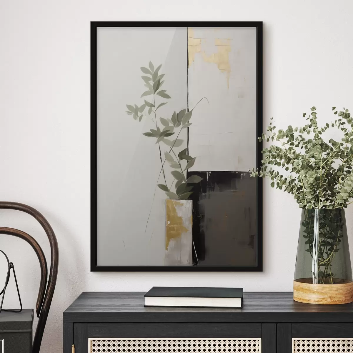Poster Een minimalistisch schilderij met textuur van een vaas met groene bladeren tegen een achtergrond van abstracte geometrische vormen. N° f47036