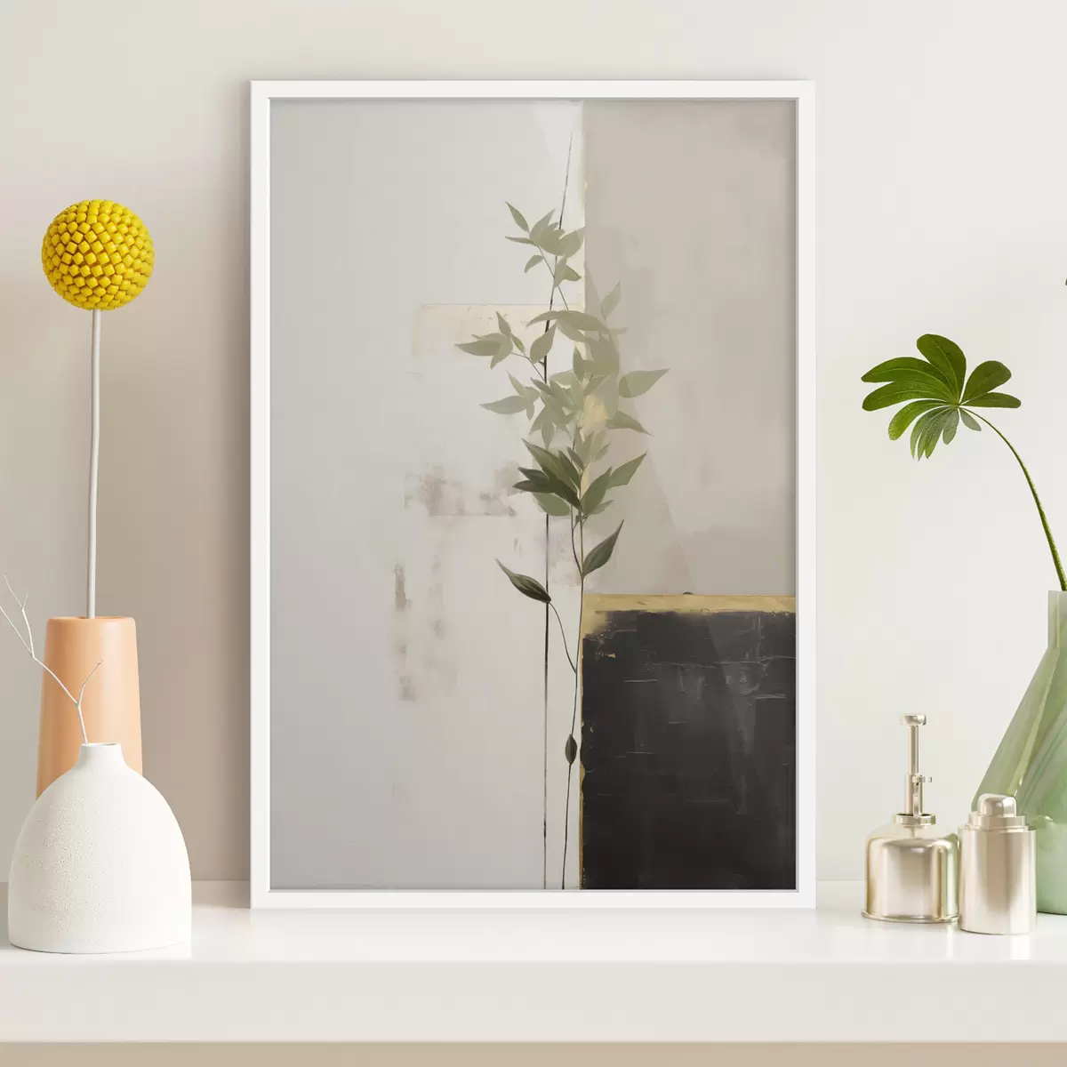 Poster Een minimalistisch schilderij met textuur van een vaas met groene bladeren tegen een achtergrond van abstracte geometrische vormen. f47037