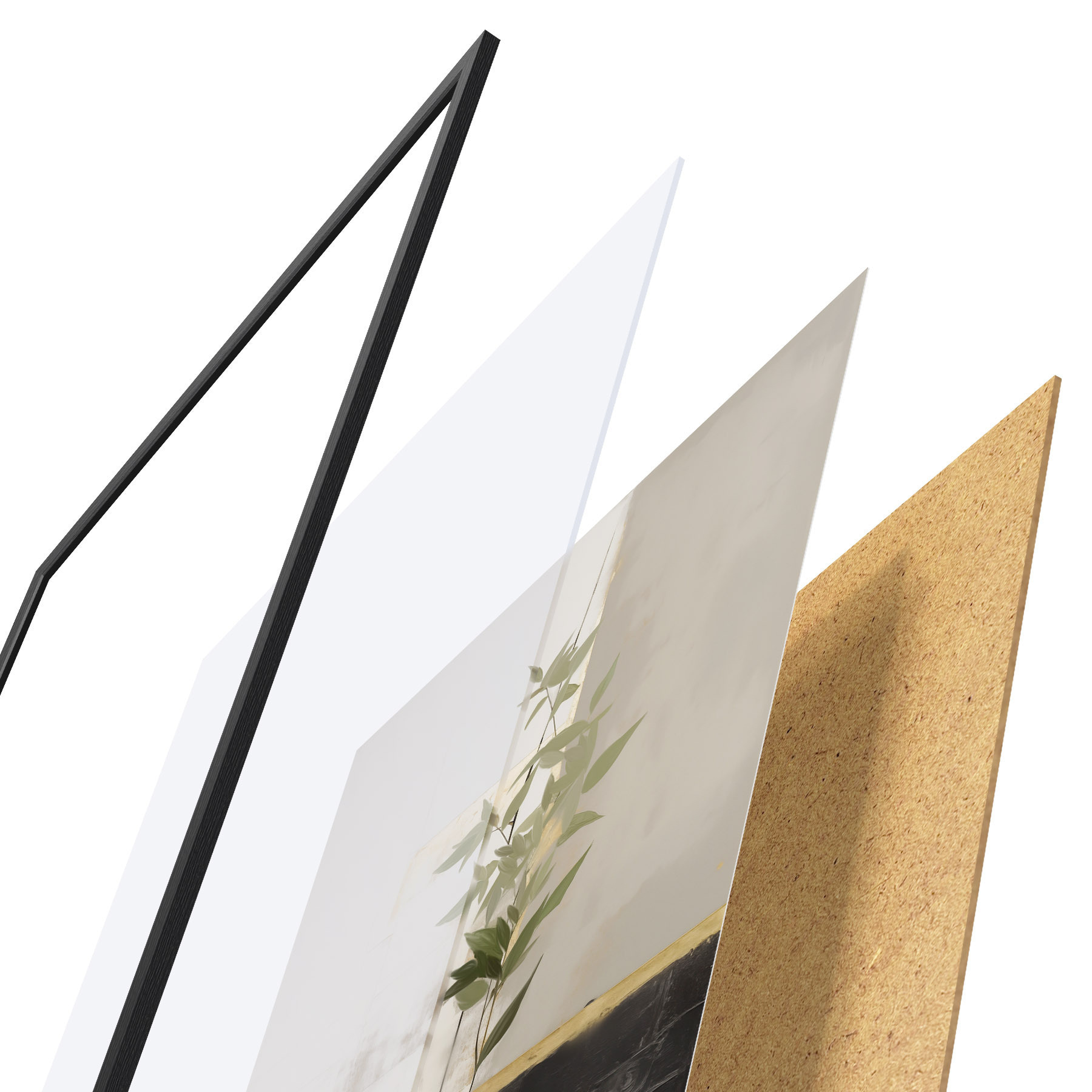 De poster bestaat uit een frame, plexiglas, geprinte afbeelding en spaanplaat achterkant. De poster kan meteen aan de muur worden gehangen dankzij de bevestigingen op de achterkant.