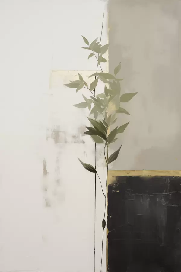 Poster Een minimalistisch schilderij met textuur van een vaas met groene bladeren tegen een achtergrond van abstracte geometrische vormen N° f47037