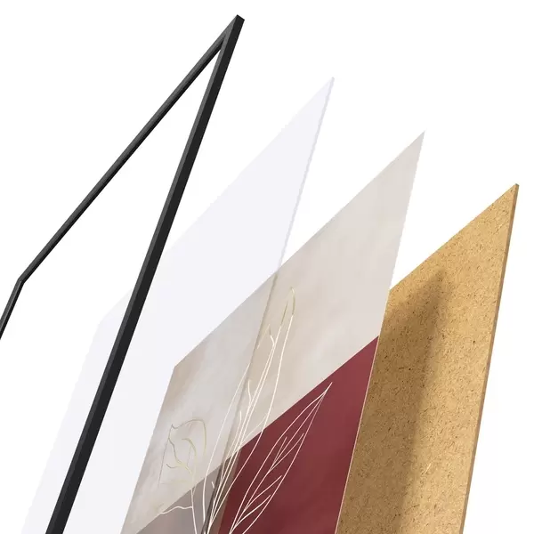 De poster bestaat uit een frame, plexiglas, geprinte afbeelding en spaanplaat achterkant. De poster kan meteen aan de muur worden gehangen dankzij de bevestigingen op de achterkant.