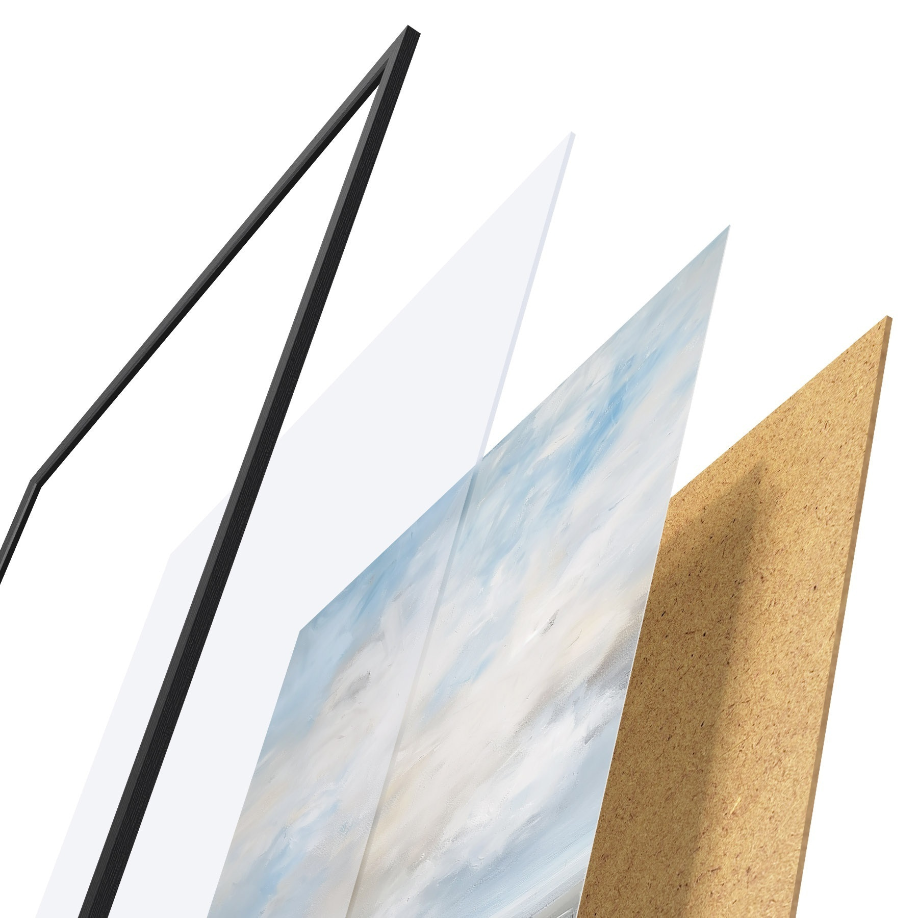 De poster bestaat uit een frame, plexiglas, geprinte afbeelding en spaanplaat achterkant. De poster kan meteen aan de muur worden gehangen dankzij de bevestigingen op de achterkant.