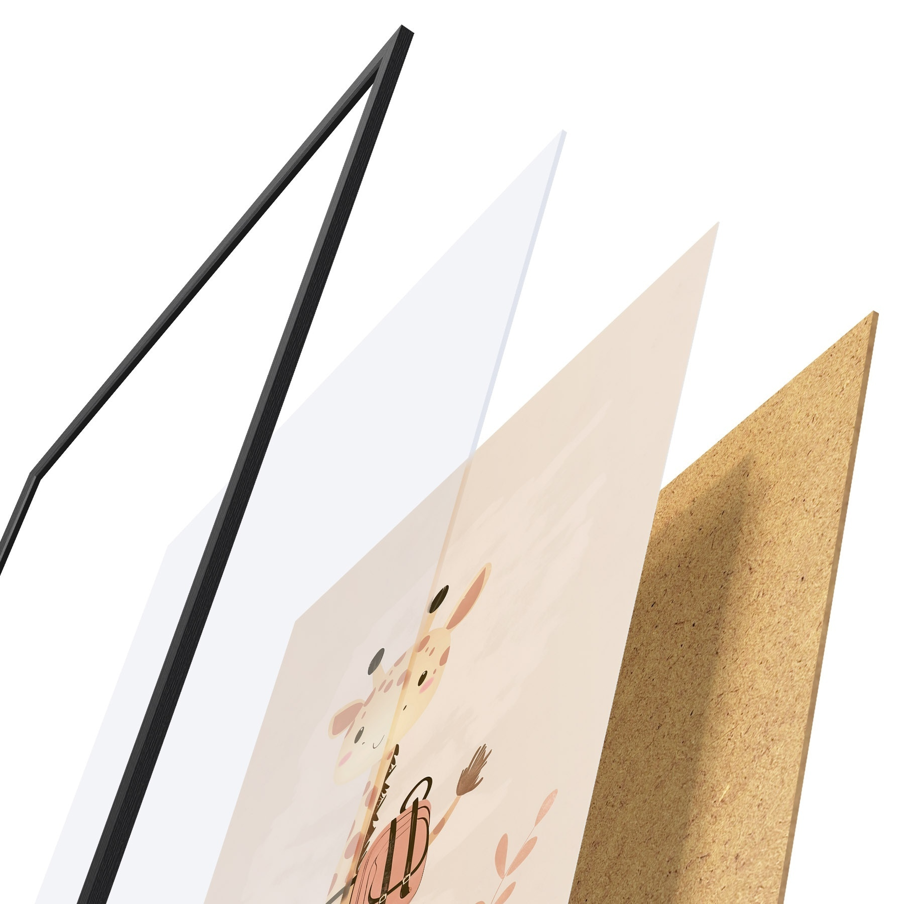 De poster bestaat uit een frame, plexiglas, geprinte afbeelding en spaanplaat achterkant. De poster kan meteen aan de muur worden gehangen dankzij de bevestigingen op de achterkant.