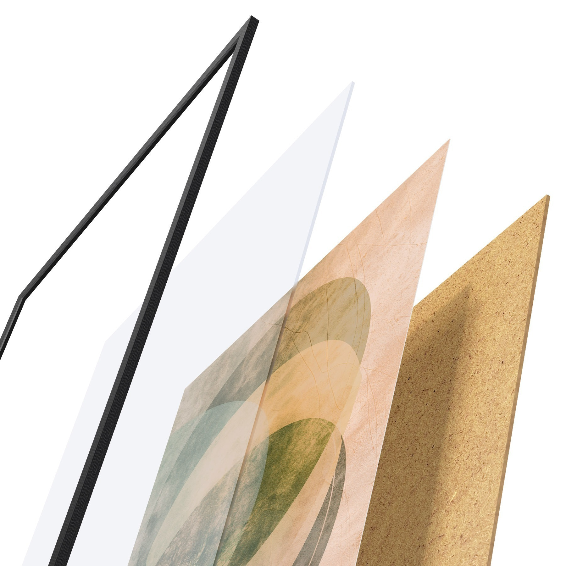 De poster bestaat uit een frame, plexiglas, geprinte afbeelding en spaanplaat achterkant. De poster kan meteen aan de muur worden gehangen dankzij de bevestigingen op de achterkant.