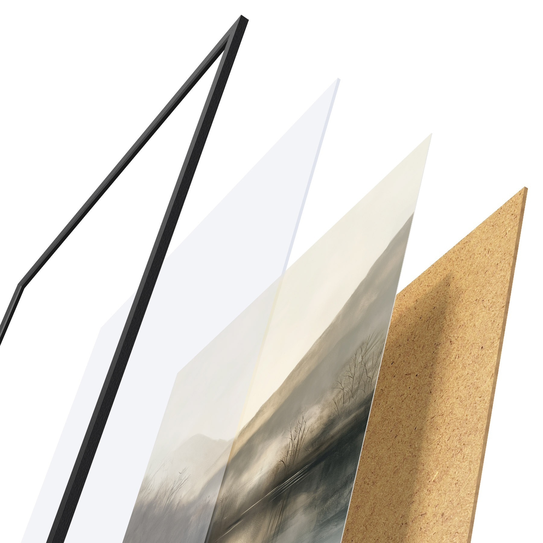 De poster bestaat uit een frame, plexiglas, geprinte afbeelding en spaanplaat achterkant. De poster kan meteen aan de muur worden gehangen dankzij de bevestigingen op de achterkant.