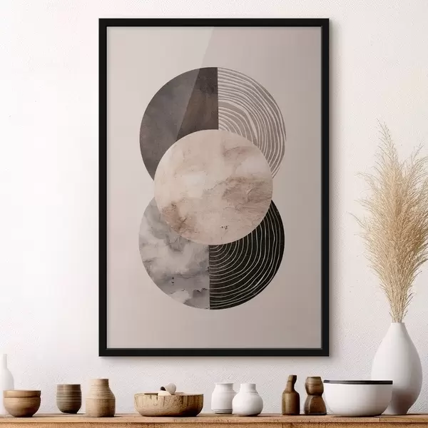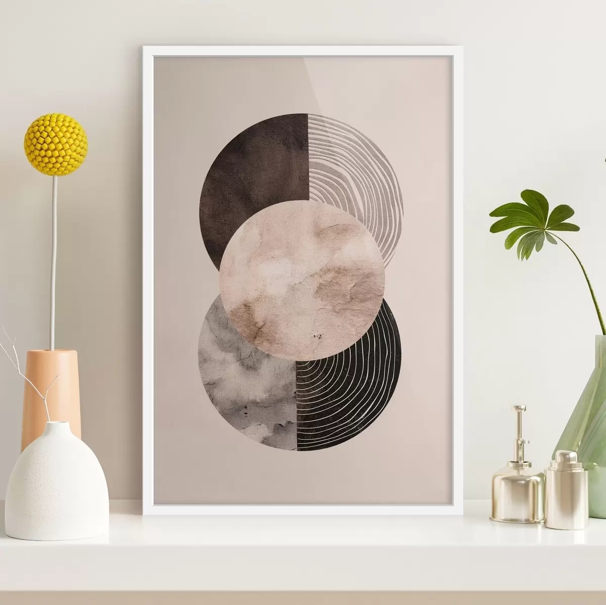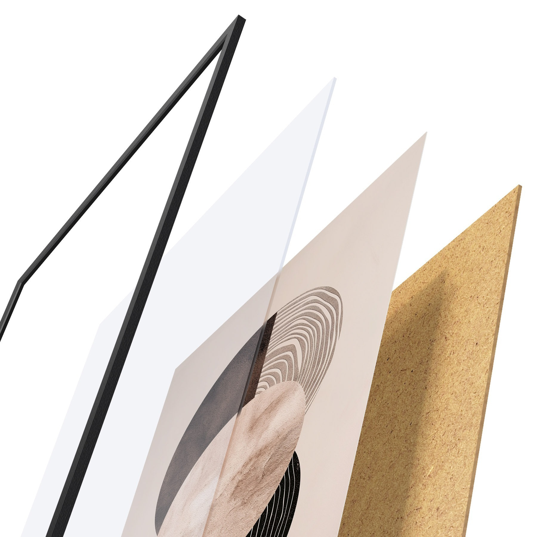 De poster bestaat uit een frame, plexiglas, geprinte afbeelding en spaanplaat achterkant. De poster kan meteen aan de muur worden gehangen dankzij de bevestigingen op de achterkant.