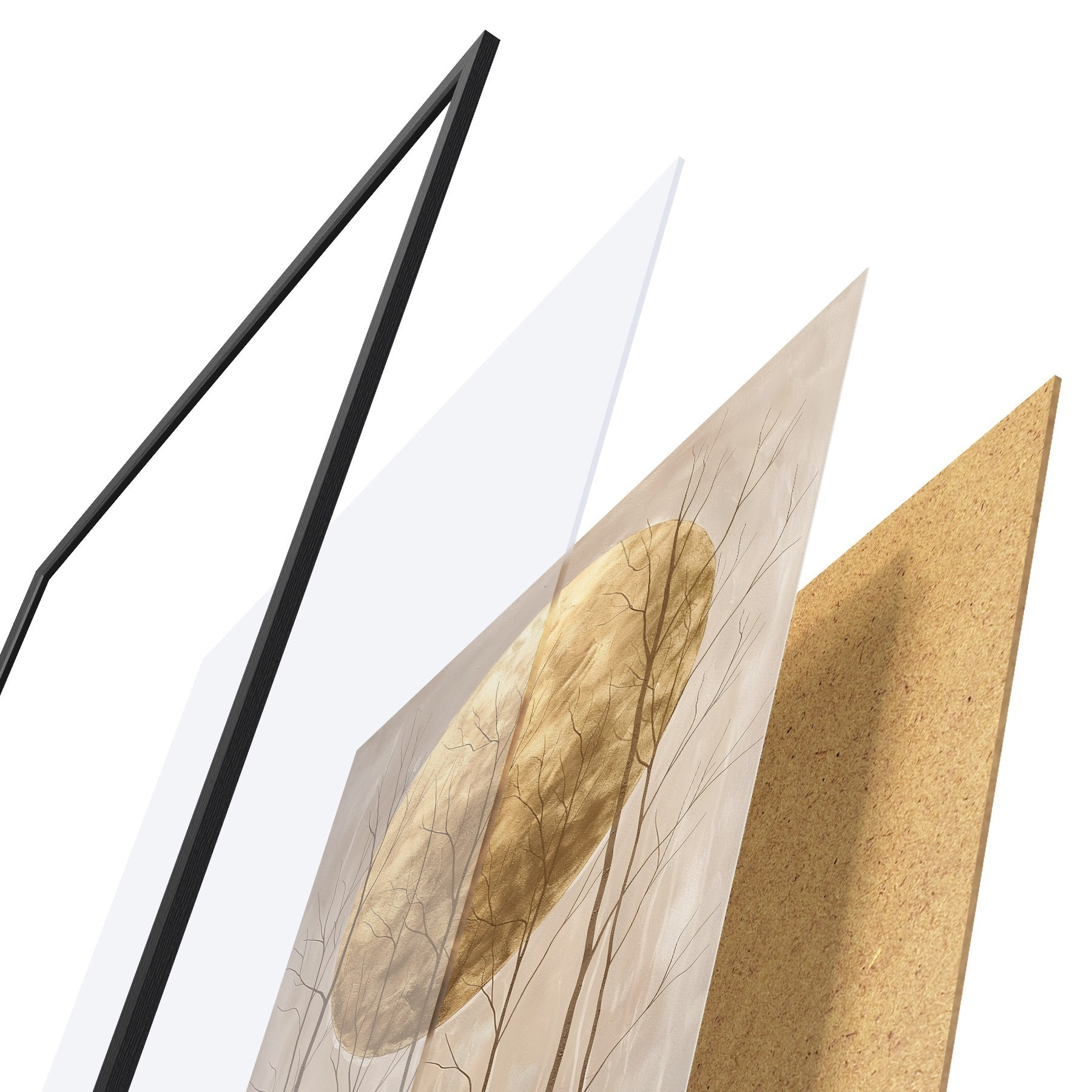 De poster bestaat uit een frame, plexiglas, geprinte afbeelding en spaanplaat achterkant. De poster kan meteen aan de muur worden gehangen dankzij de bevestigingen op de achterkant.