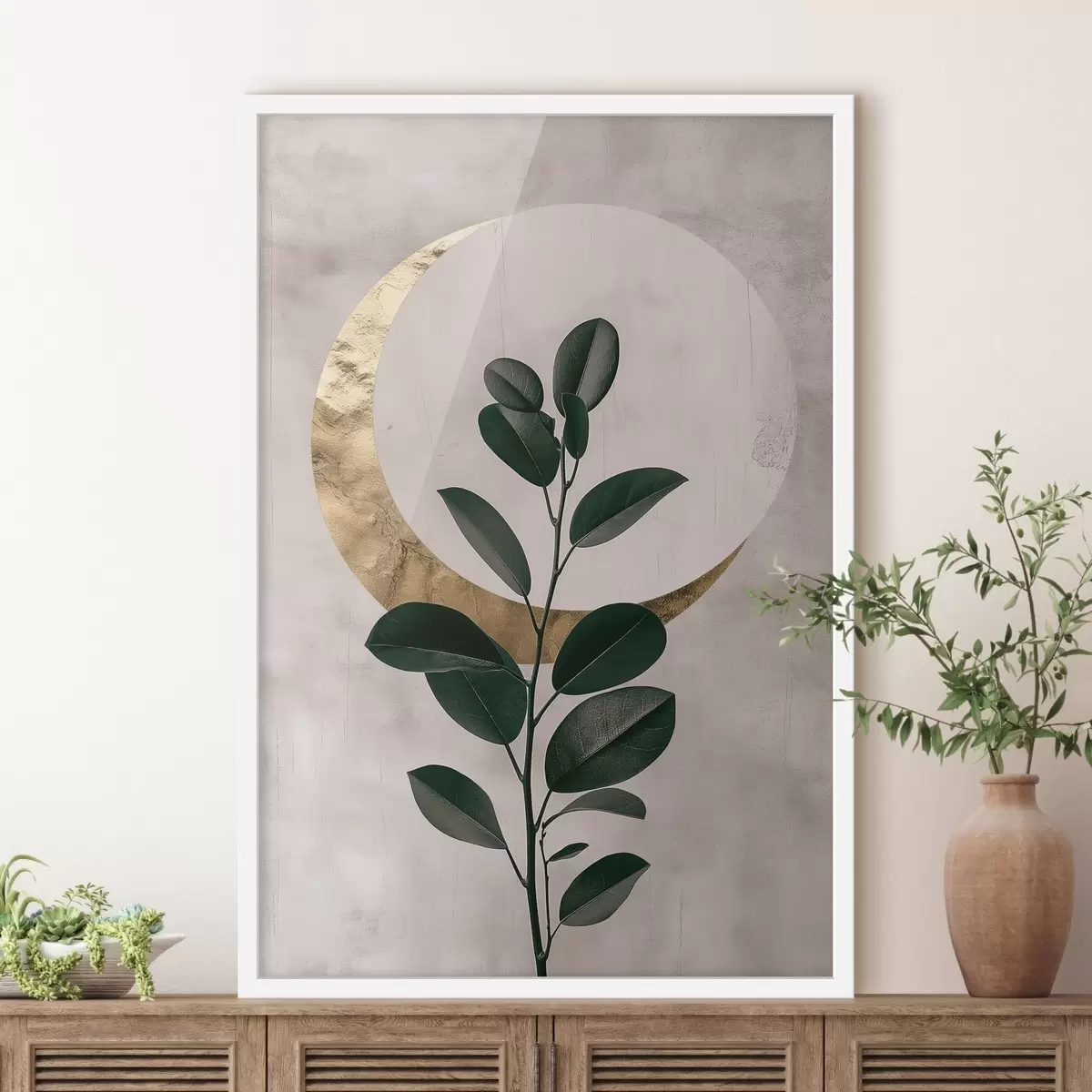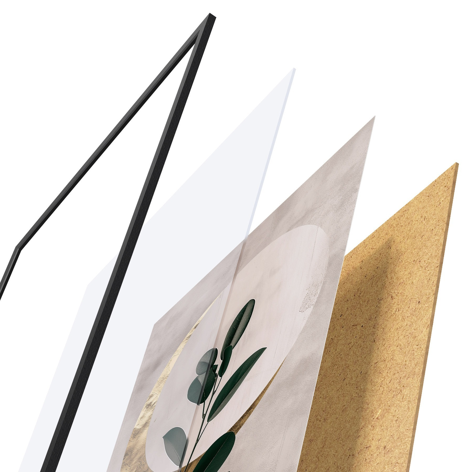 De poster bestaat uit een frame, plexiglas, geprinte afbeelding en spaanplaat achterkant. De poster kan meteen aan de muur worden gehangen dankzij de bevestigingen op de achterkant.