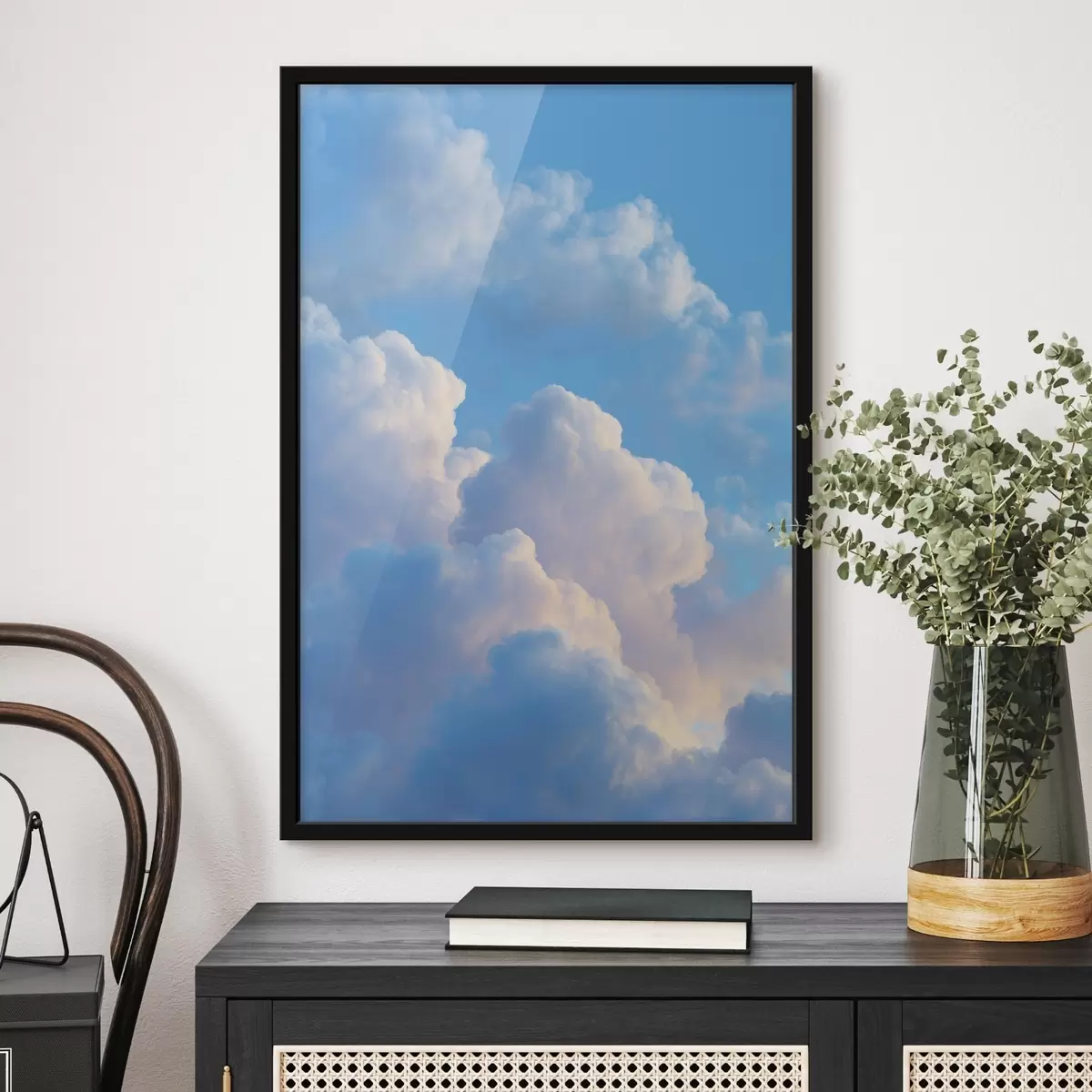 Poster Volumineuze wolken in een zacht blauw en roze kleurenpalet in fotorealistische digitale grafische stijl N° f47088