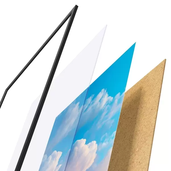 De poster bestaat uit een frame, plexiglas, geprinte afbeelding en spaanplaat achterkant. De poster kan meteen aan de muur worden gehangen dankzij de bevestigingen op de achterkant.