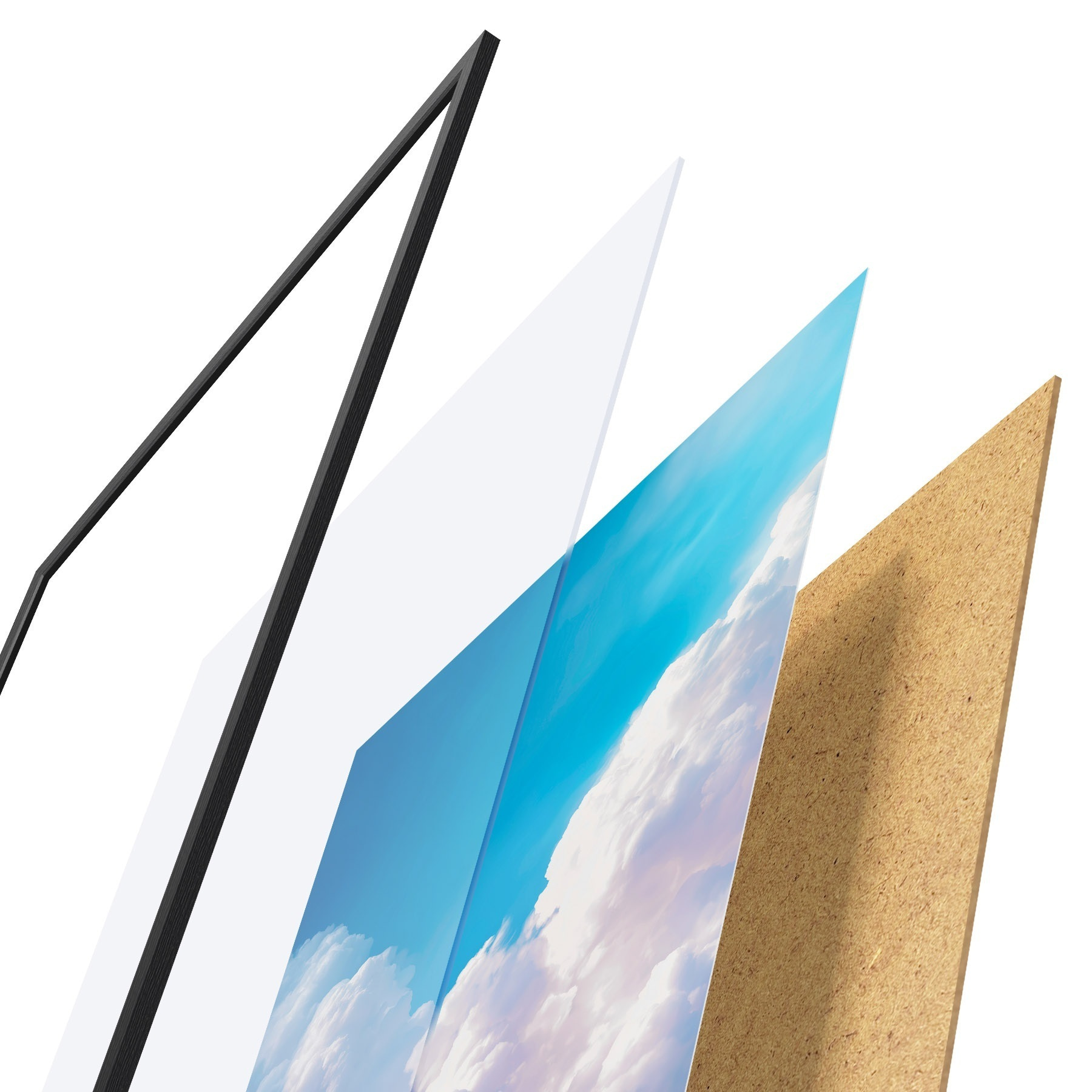 De poster bestaat uit een frame, plexiglas, geprinte afbeelding en spaanplaat achterkant. De poster kan meteen aan de muur worden gehangen dankzij de bevestigingen op de achterkant.