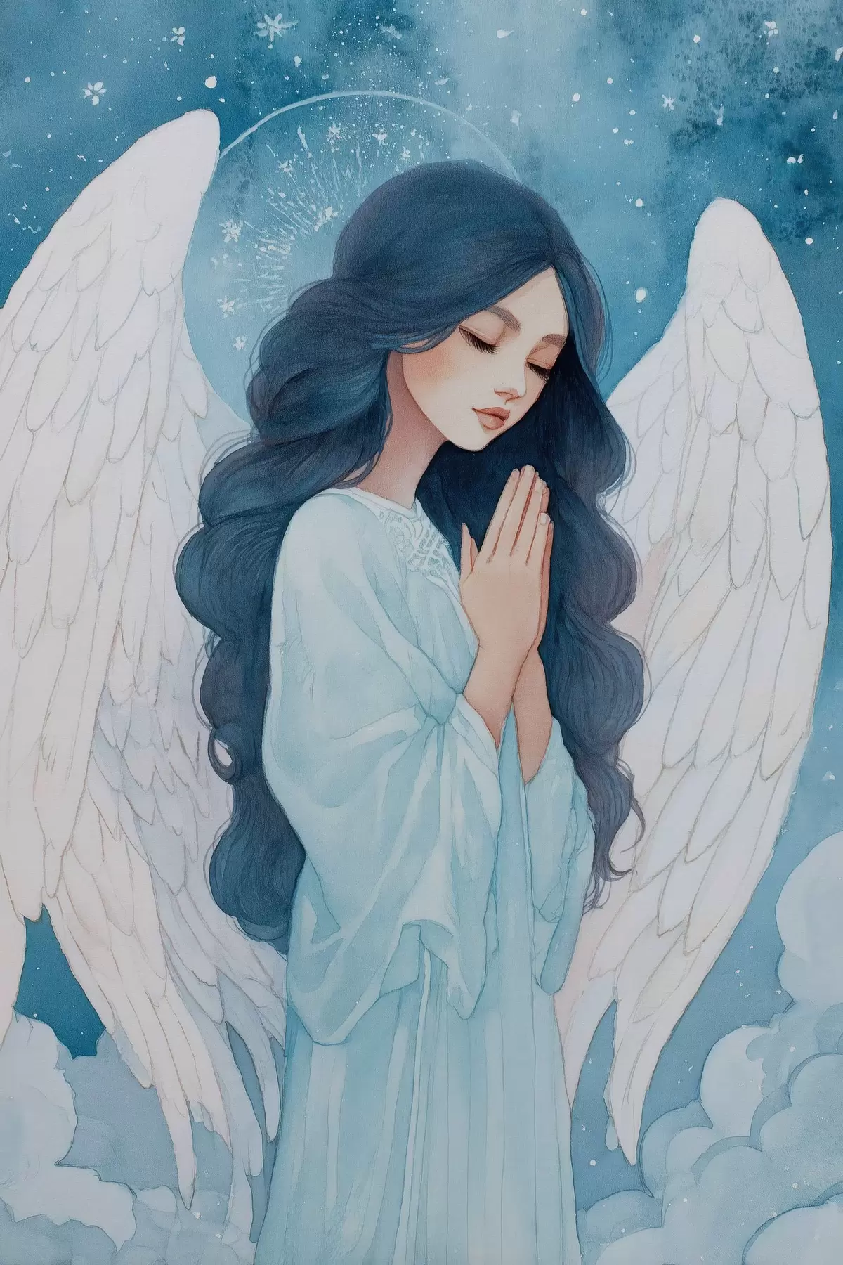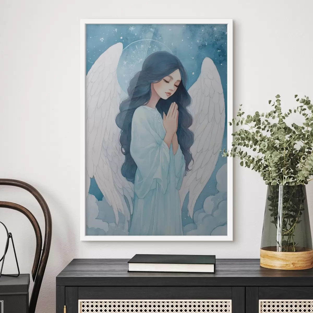 Poster Charmante illustratie van een engel tussen wolken in een wit en blauw kleurenpalet N° f47095
