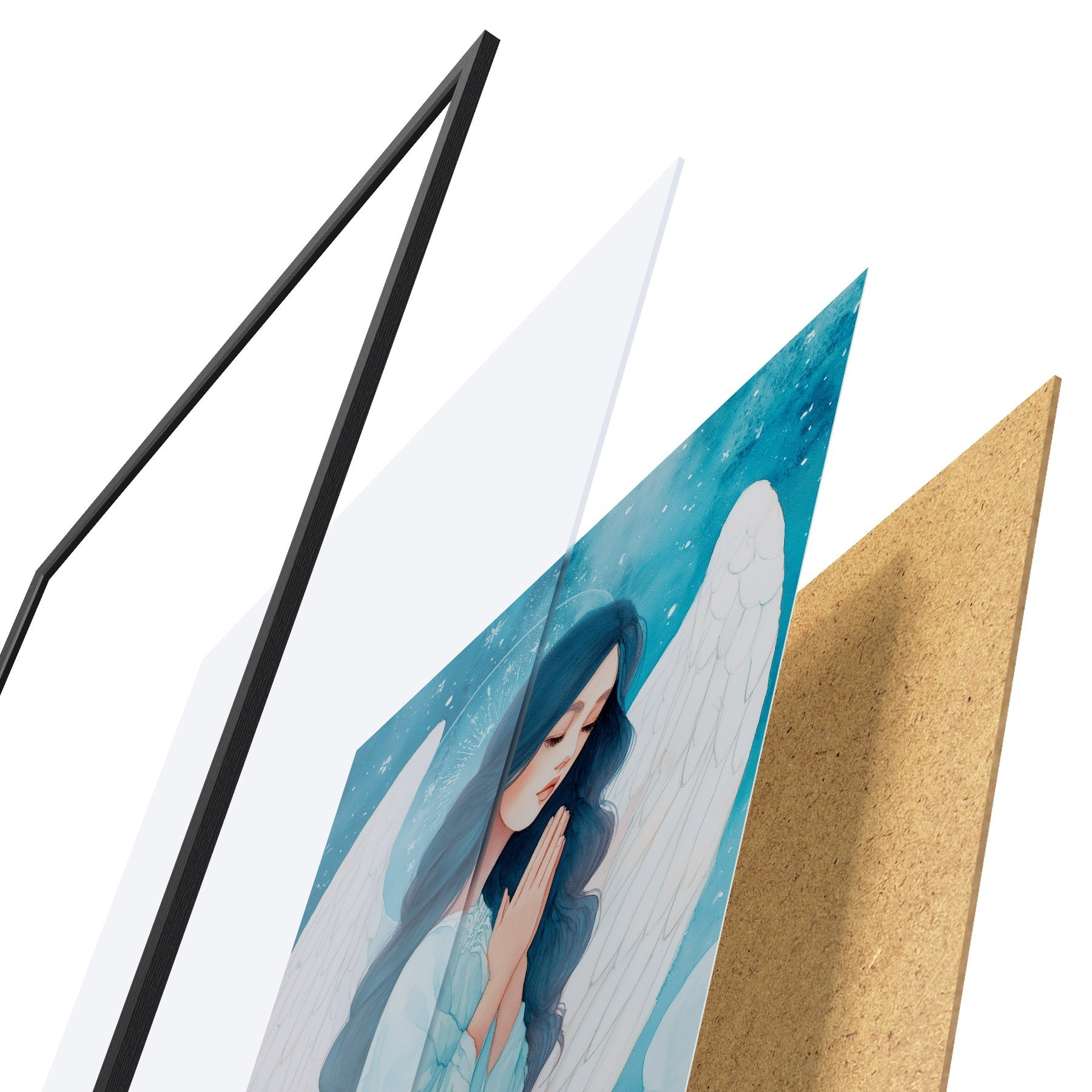 De poster bestaat uit een frame, plexiglas, geprinte afbeelding en spaanplaat achterkant. De poster kan meteen aan de muur worden gehangen dankzij de bevestigingen op de achterkant.