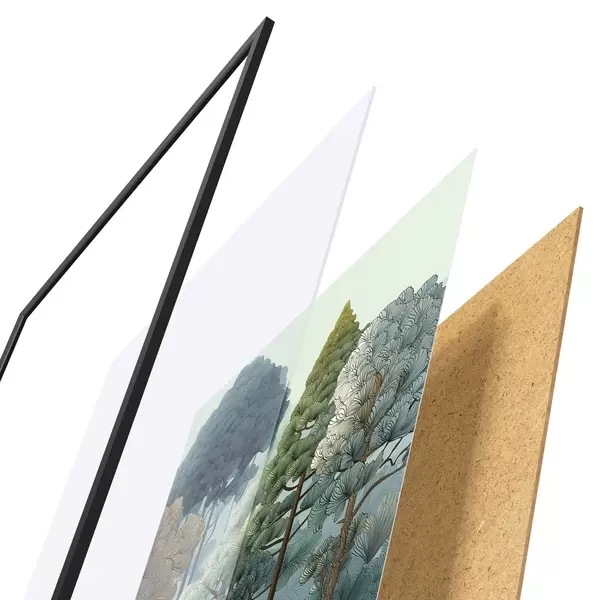 De poster bestaat uit een frame, plexiglas, geprinte afbeelding en spaanplaat achterkant. De poster kan meteen aan de muur worden gehangen dankzij de bevestigingen op de achterkant.