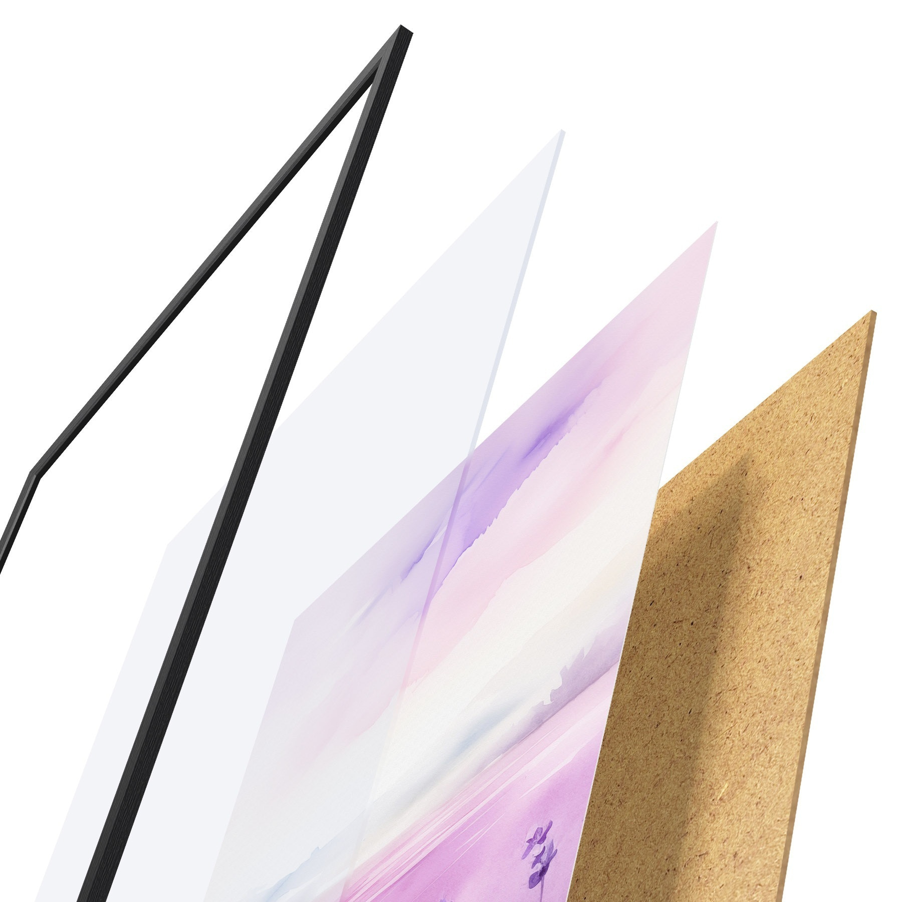 De poster bestaat uit een frame, plexiglas, geprinte afbeelding en spaanplaat achterkant. De poster kan meteen aan de muur worden gehangen dankzij de bevestigingen op de achterkant.