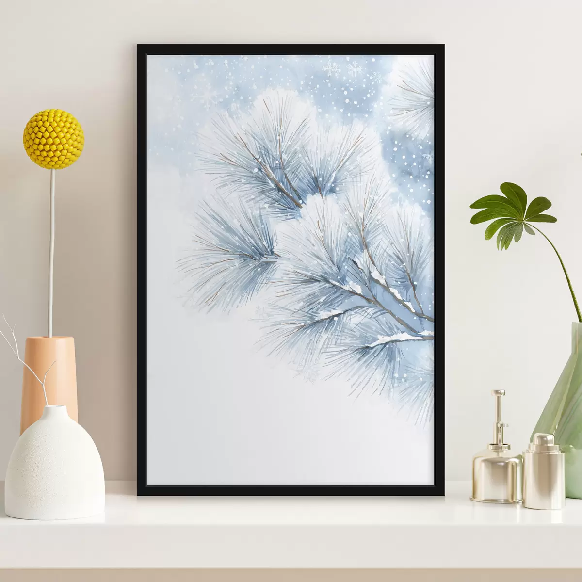 Poster met sneeuw bedekte dennentak in aquarelstijl N° f47114