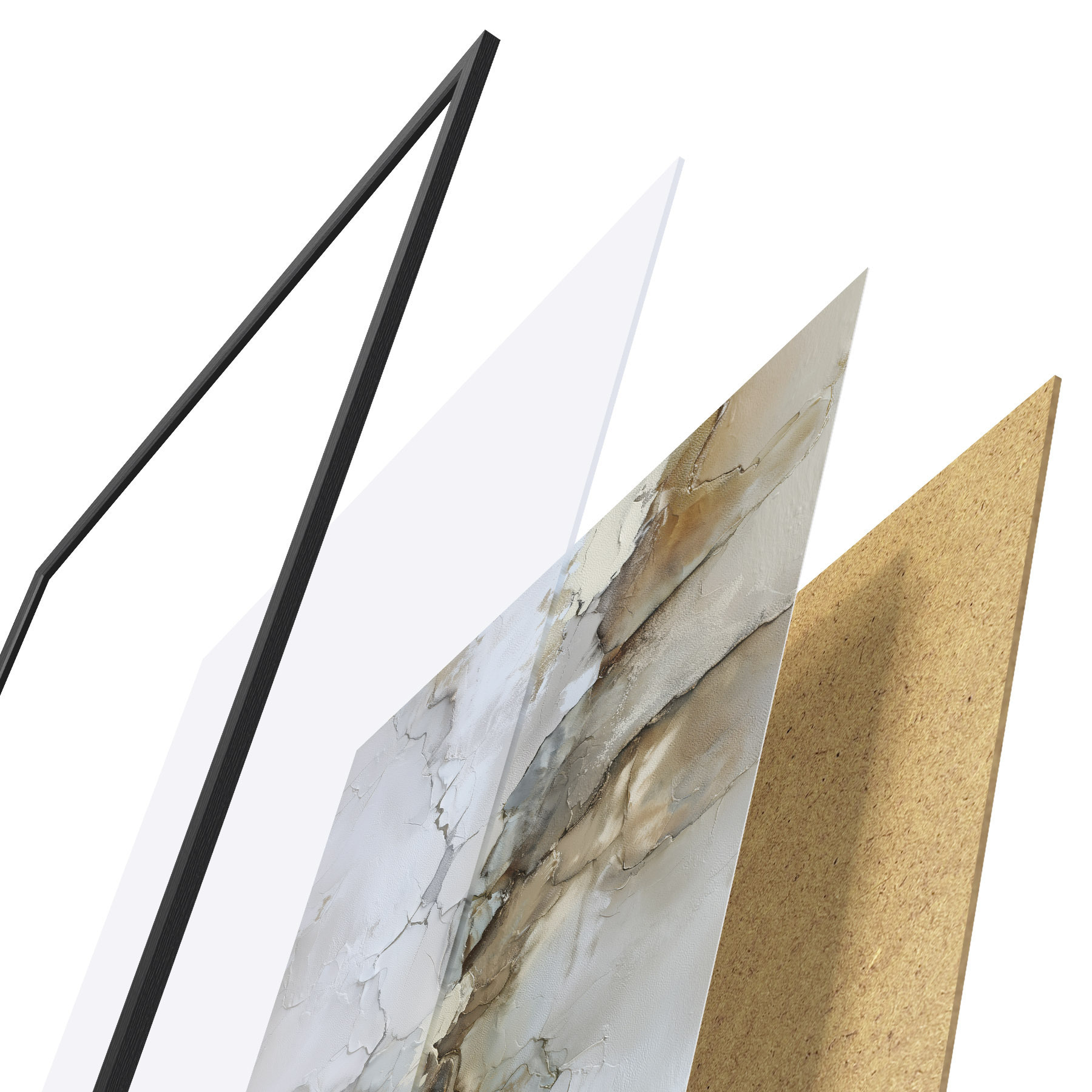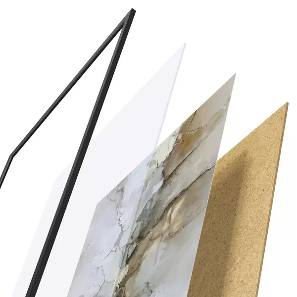 De poster bestaat uit een frame, plexiglas, geprinte afbeelding en spaanplaat achterkant. De poster kan meteen aan de muur worden gehangen dankzij de bevestigingen op de achterkant.