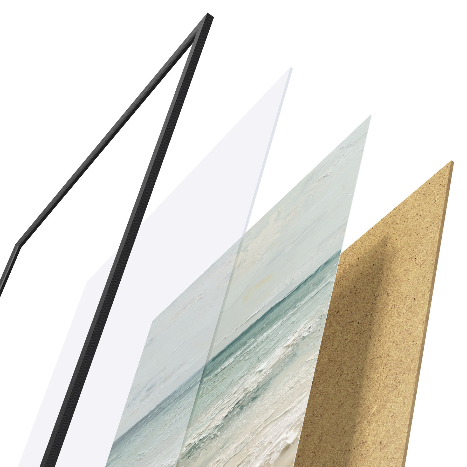 De poster bestaat uit een frame, plexiglas, geprinte afbeelding en spaanplaat achterkant. De poster kan meteen aan de muur worden gehangen dankzij de bevestigingen op de achterkant.