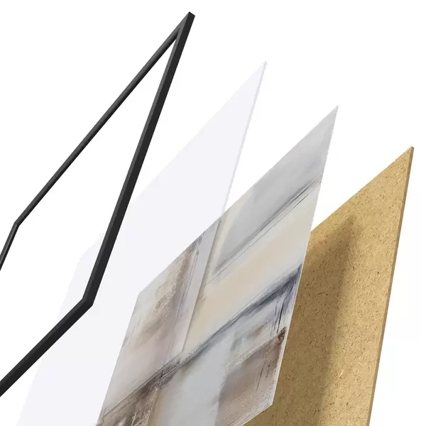 De poster bestaat uit een frame, plexiglas, geprinte afbeelding en spaanplaat achterkant. De poster kan meteen aan de muur worden gehangen dankzij de bevestigingen op de achterkant.