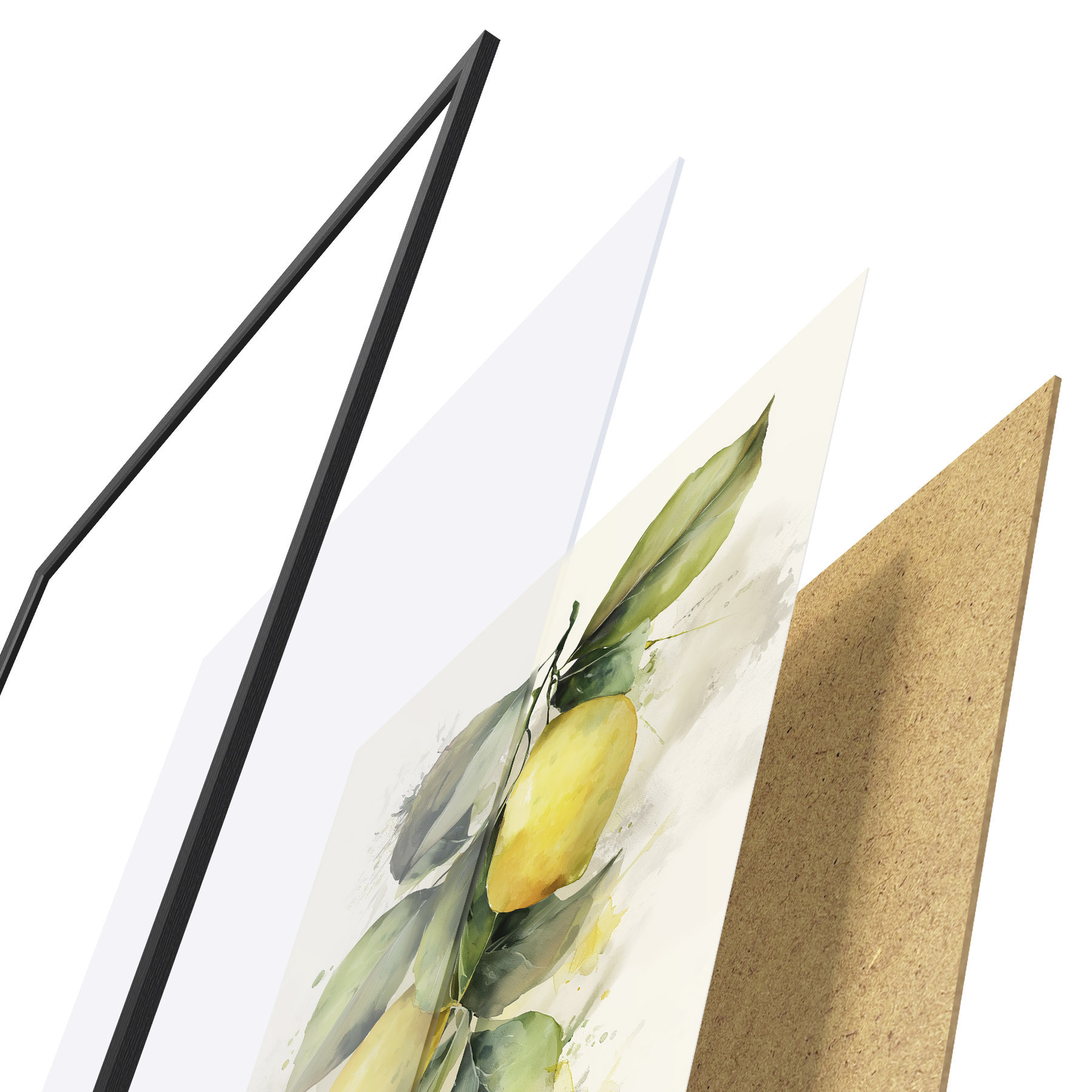 De poster bestaat uit een frame, plexiglas, geprinte afbeelding en spaanplaat achterkant. De poster kan meteen aan de muur worden gehangen dankzij de bevestigingen op de achterkant.