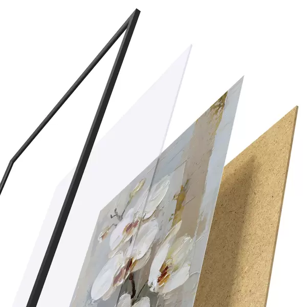 De poster bestaat uit een frame, plexiglas, geprinte afbeelding en spaanplaat achterkant. De poster kan meteen aan de muur worden gehangen dankzij de bevestigingen op de achterkant.