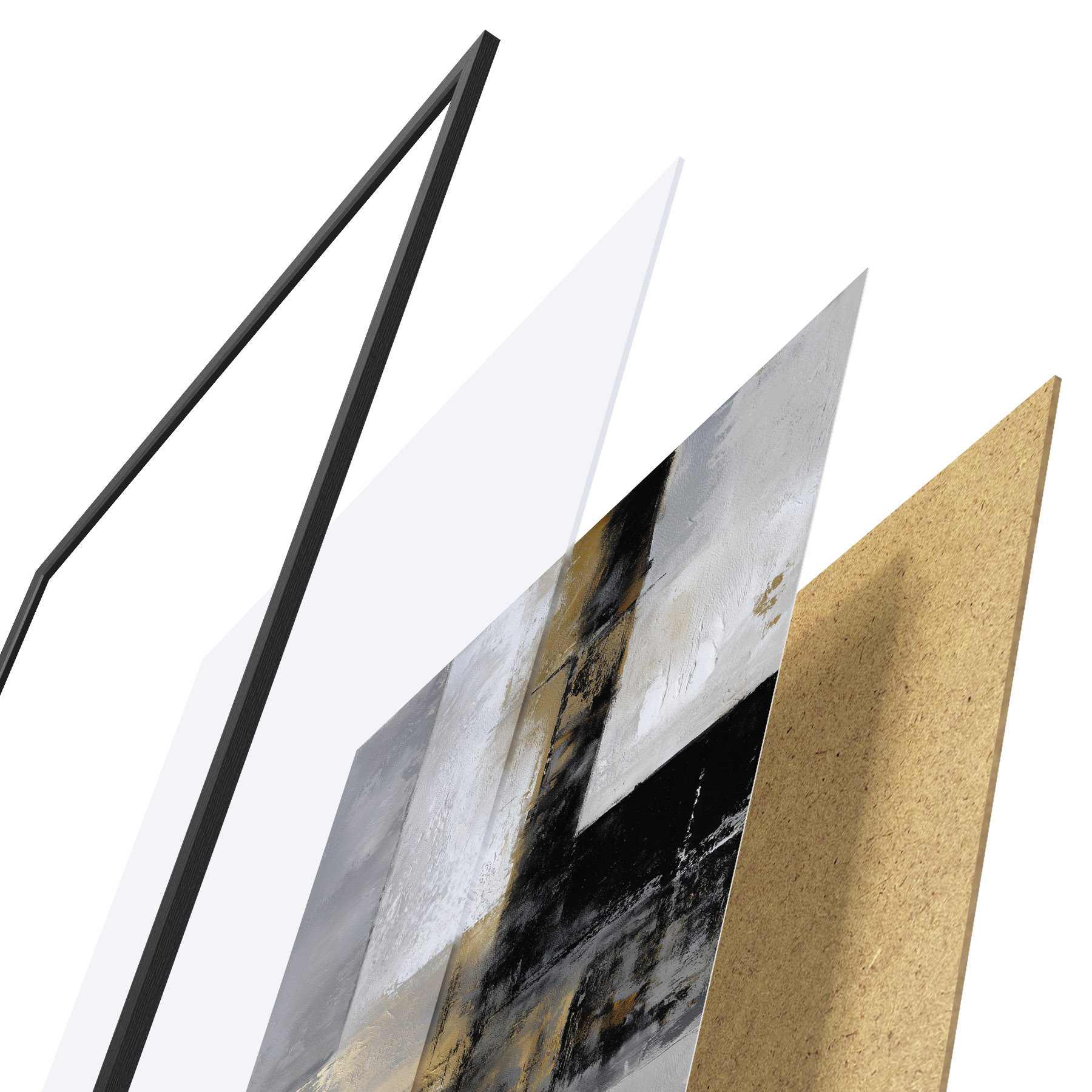 De poster bestaat uit een frame, plexiglas, geprinte afbeelding en spaanplaat achterkant. De poster kan meteen aan de muur worden gehangen dankzij de bevestigingen op de achterkant.