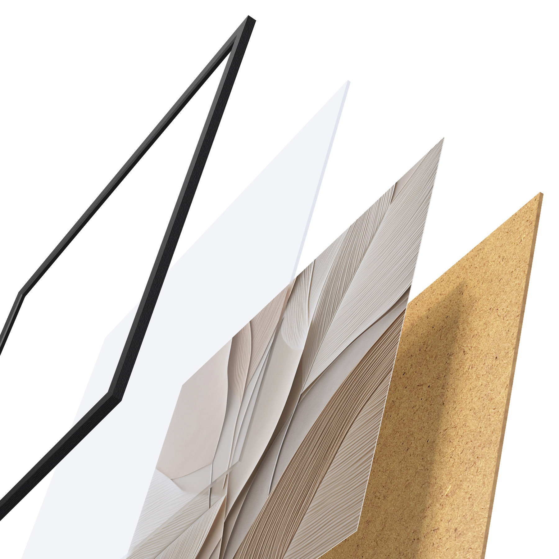 De poster bestaat uit een frame, plexiglas, geprinte afbeelding en spaanplaat achterkant. De poster kan meteen aan de muur worden gehangen dankzij de bevestigingen op de achterkant.