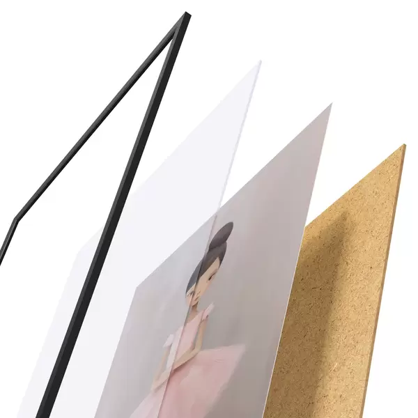 De poster bestaat uit een frame, plexiglas, geprinte afbeelding en spaanplaat achterkant. De poster kan meteen aan de muur worden gehangen dankzij de bevestigingen op de achterkant.