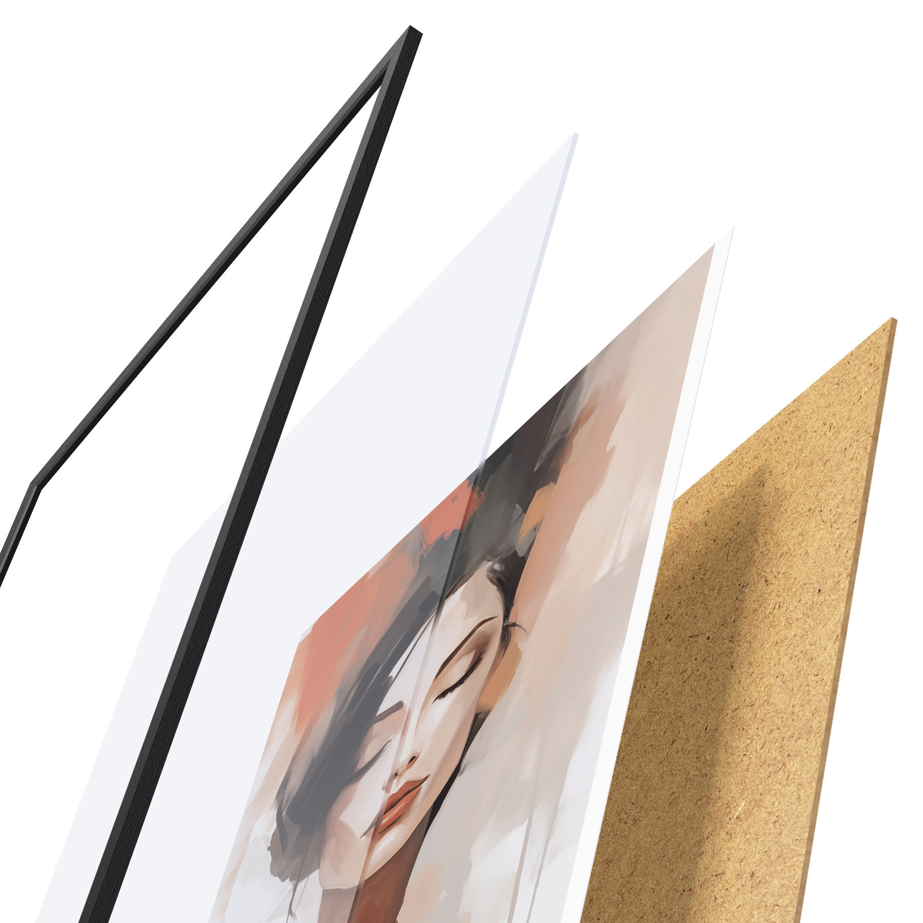De poster bestaat uit een frame, plexiglas, geprinte afbeelding en spaanplaat achterkant. De poster kan meteen aan de muur worden gehangen dankzij de bevestigingen op de achterkant.