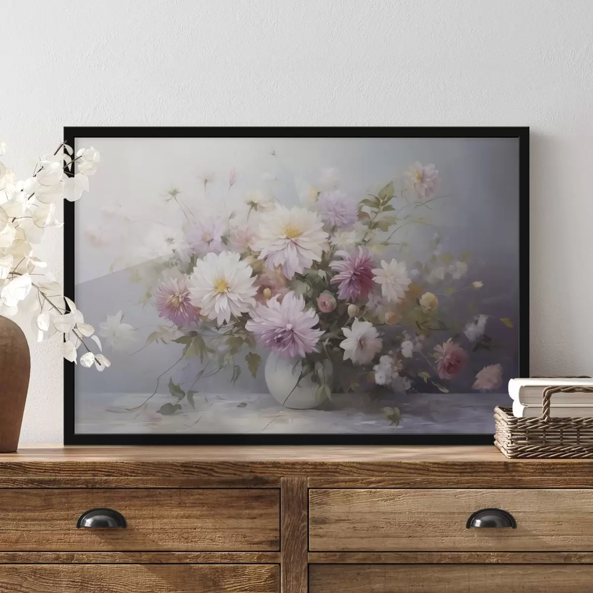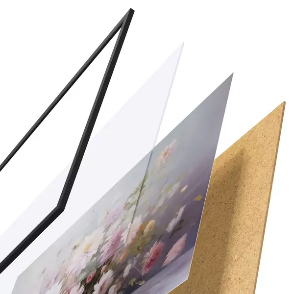 De poster bestaat uit een frame, plexiglas, geprinte afbeelding en spaanplaat achterkant. De poster kan meteen aan de muur worden gehangen dankzij de bevestigingen op de achterkant.