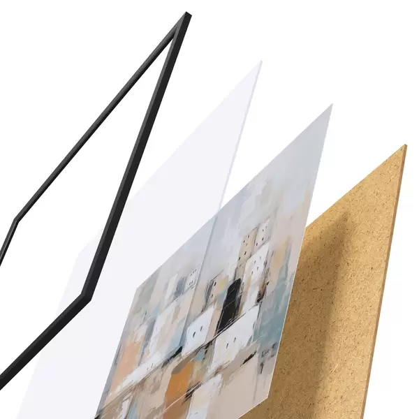 De poster bestaat uit een frame, plexiglas, geprinte afbeelding en spaanplaat achterkant. De poster kan meteen aan de muur worden gehangen dankzij de bevestigingen op de achterkant.