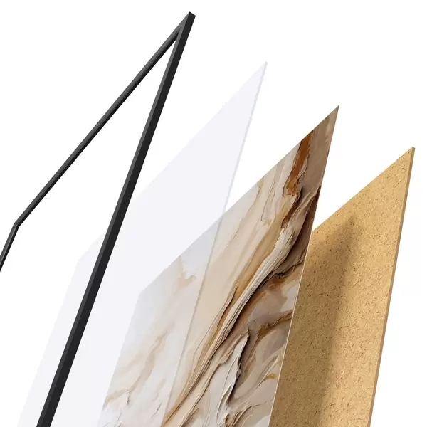 De poster bestaat uit een frame, plexiglas, geprinte afbeelding en spaanplaat achterkant. De poster kan meteen aan de muur worden gehangen dankzij de bevestigingen op de achterkant.