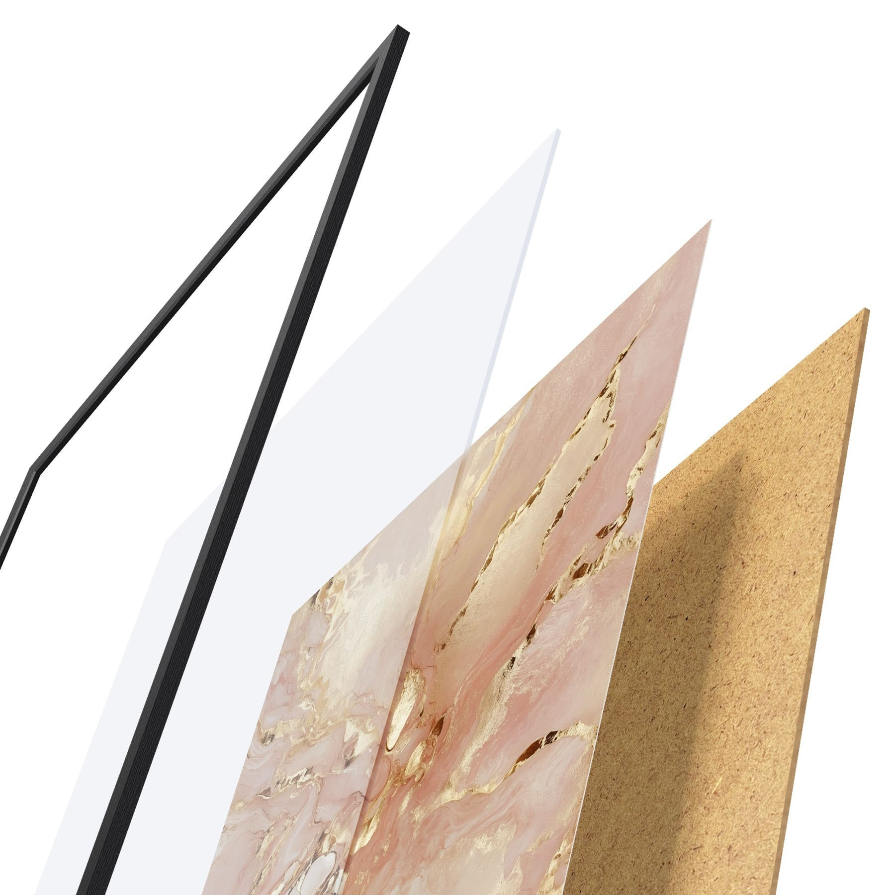 De poster bestaat uit een frame, plexiglas, geprinte afbeelding en spaanplaat achterkant. De poster kan meteen aan de muur worden gehangen dankzij de bevestigingen op de achterkant.