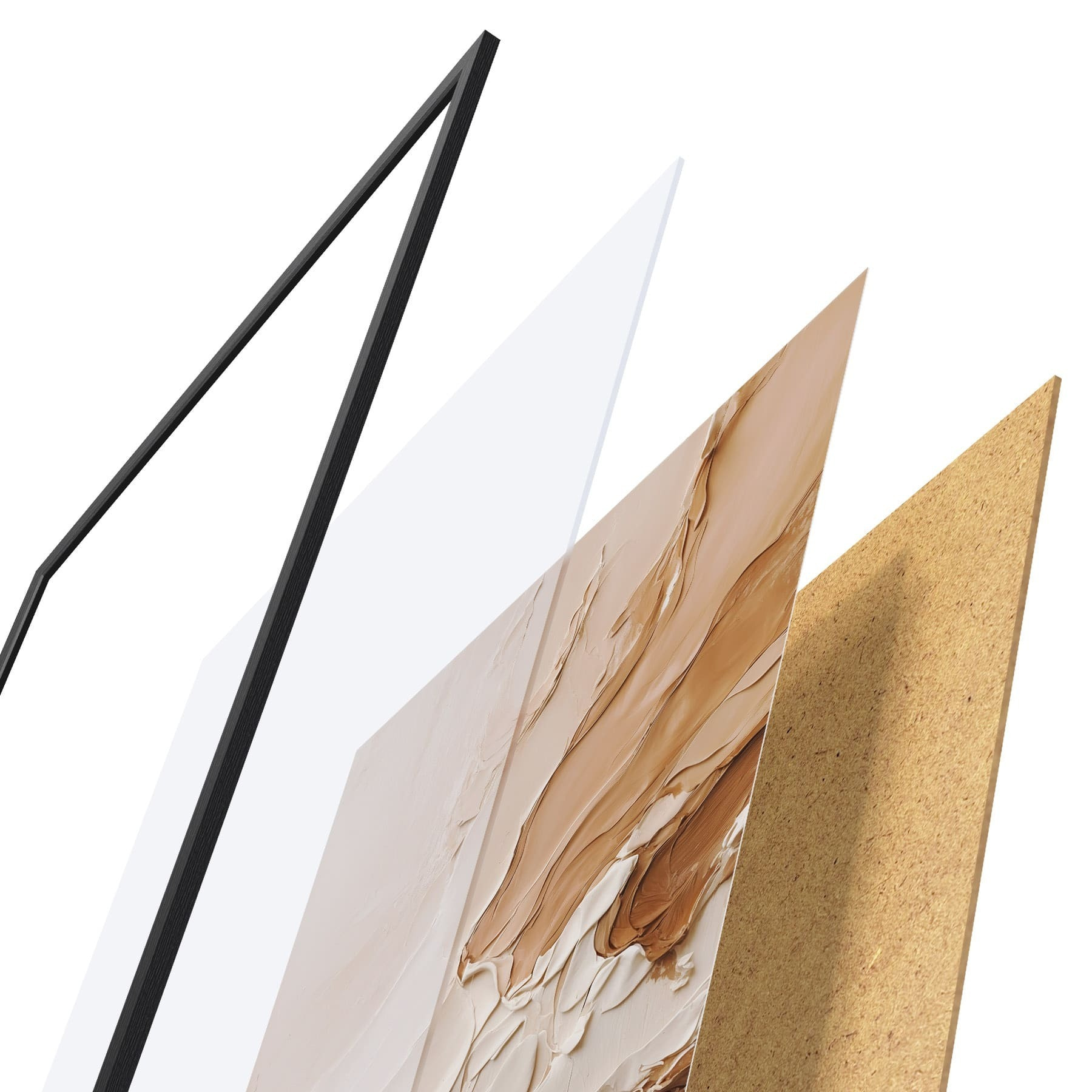De poster bestaat uit een frame, plexiglas, geprinte afbeelding en spaanplaat achterkant. De poster kan meteen aan de muur worden gehangen dankzij de bevestigingen op de achterkant.