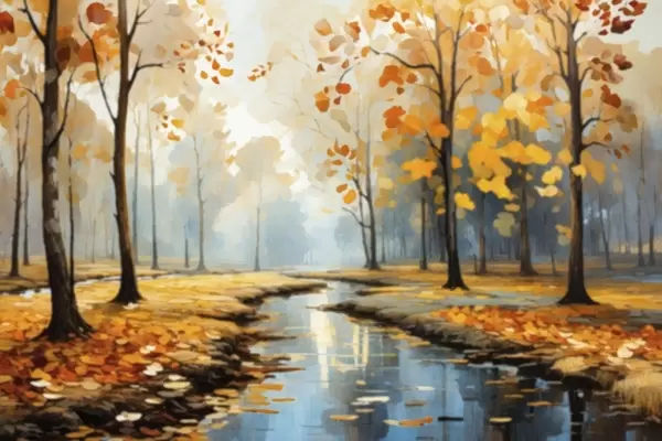 Poster Herfstbos met een beekje en gele bladeren N° f47278