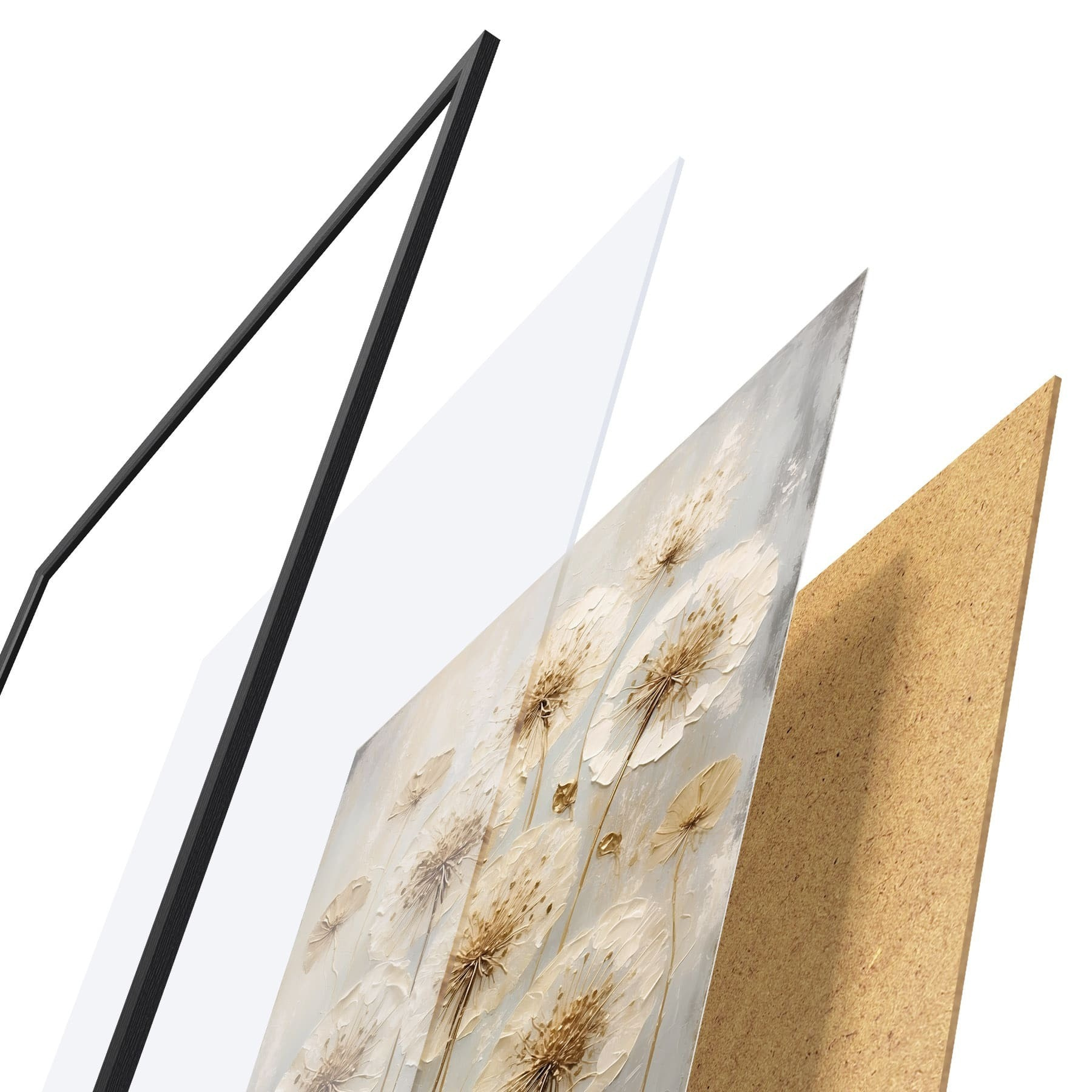 De poster bestaat uit een frame, plexiglas, geprinte afbeelding en spaanplaat achterkant. De poster kan meteen aan de muur worden gehangen dankzij de bevestigingen op de achterkant.