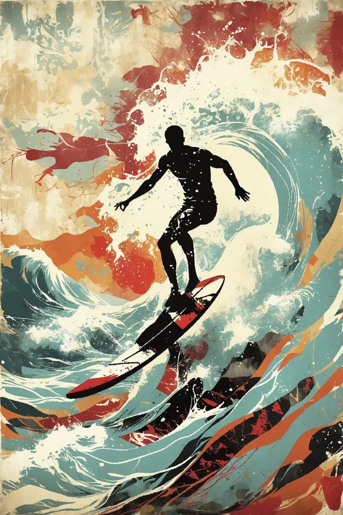 Poster Surfer silhouet op golven in levendige kleuren N° f47284