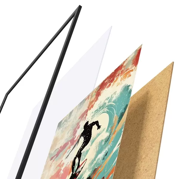 De poster bestaat uit een frame, plexiglas, geprinte afbeelding en spaanplaat achterkant. De poster kan meteen aan de muur worden gehangen dankzij de bevestigingen op de achterkant.