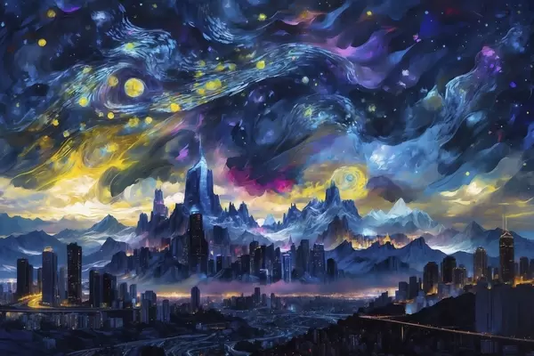 Poster Fantasie stad onder een stralende nachtelijke hemel N° f47288