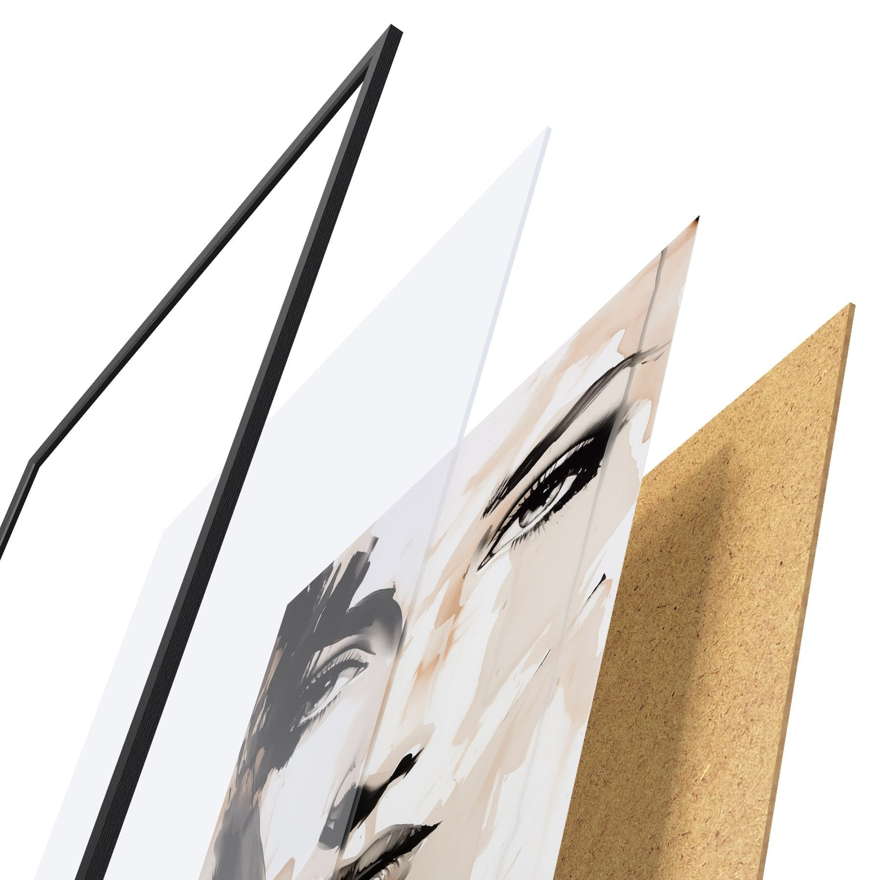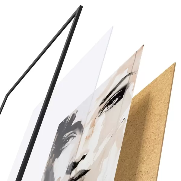 De poster bestaat uit een frame, plexiglas, geprinte afbeelding en spaanplaat achterkant. De poster kan meteen aan de muur worden gehangen dankzij de bevestigingen op de achterkant.