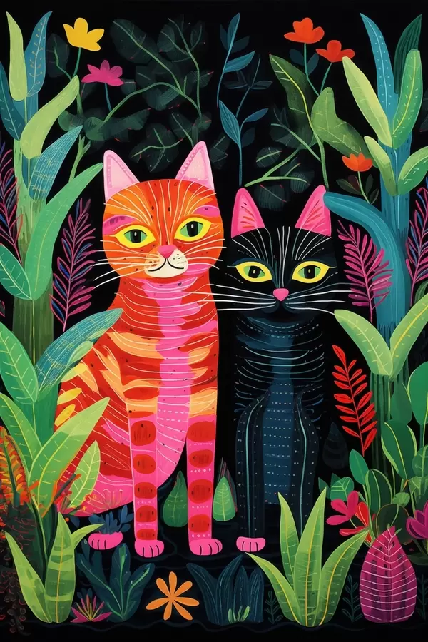 Poster Twee gestileerde katten tussen levendige planten N° f47298