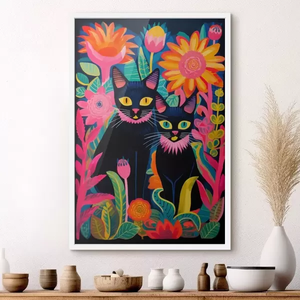 Poster Twee zwarte katten tussen heldere bloemen N° f47299
