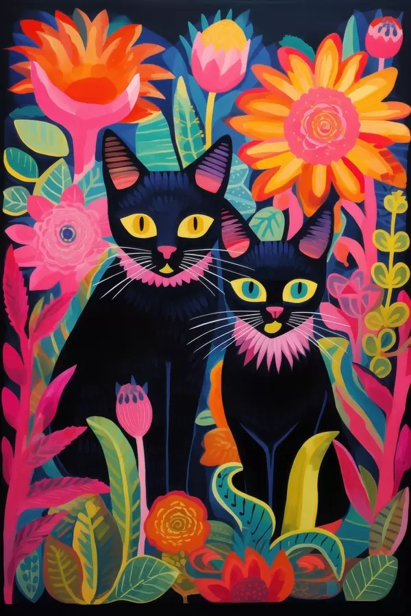 Poster Twee zwarte katten tussen heldere bloemen N° f47299