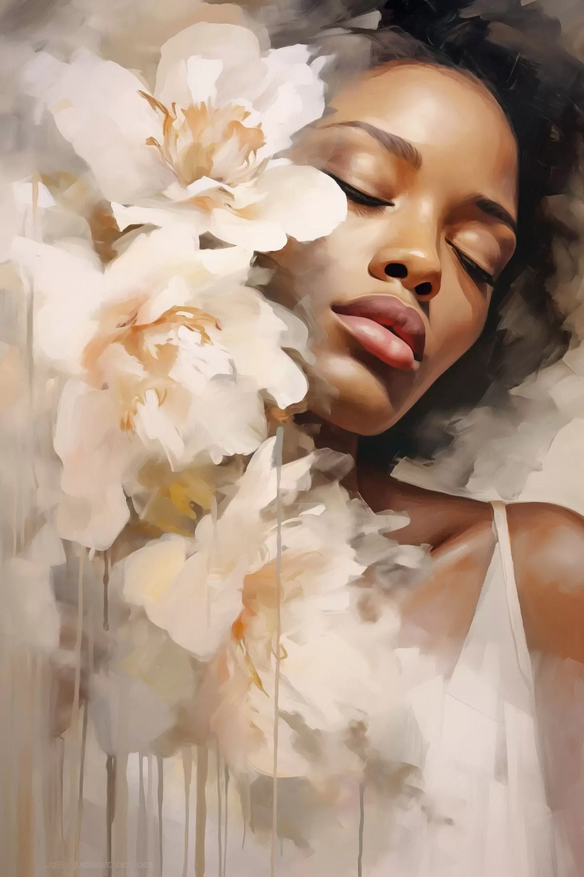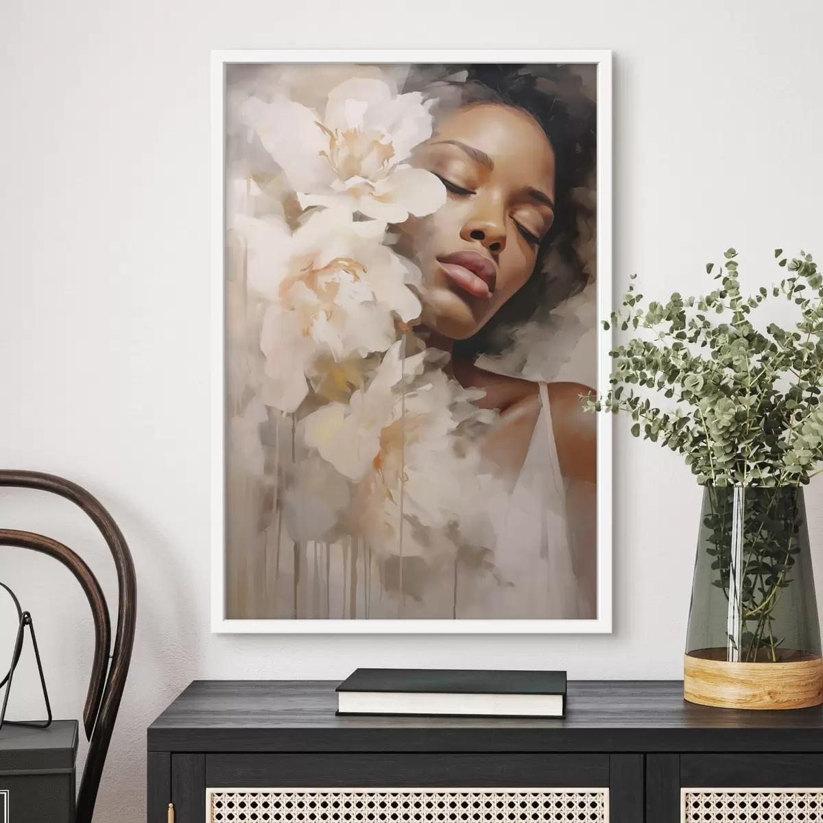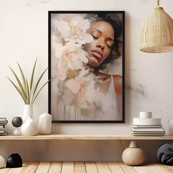 Poster Vrouwelijk portret naast grote bloemen N° f47307