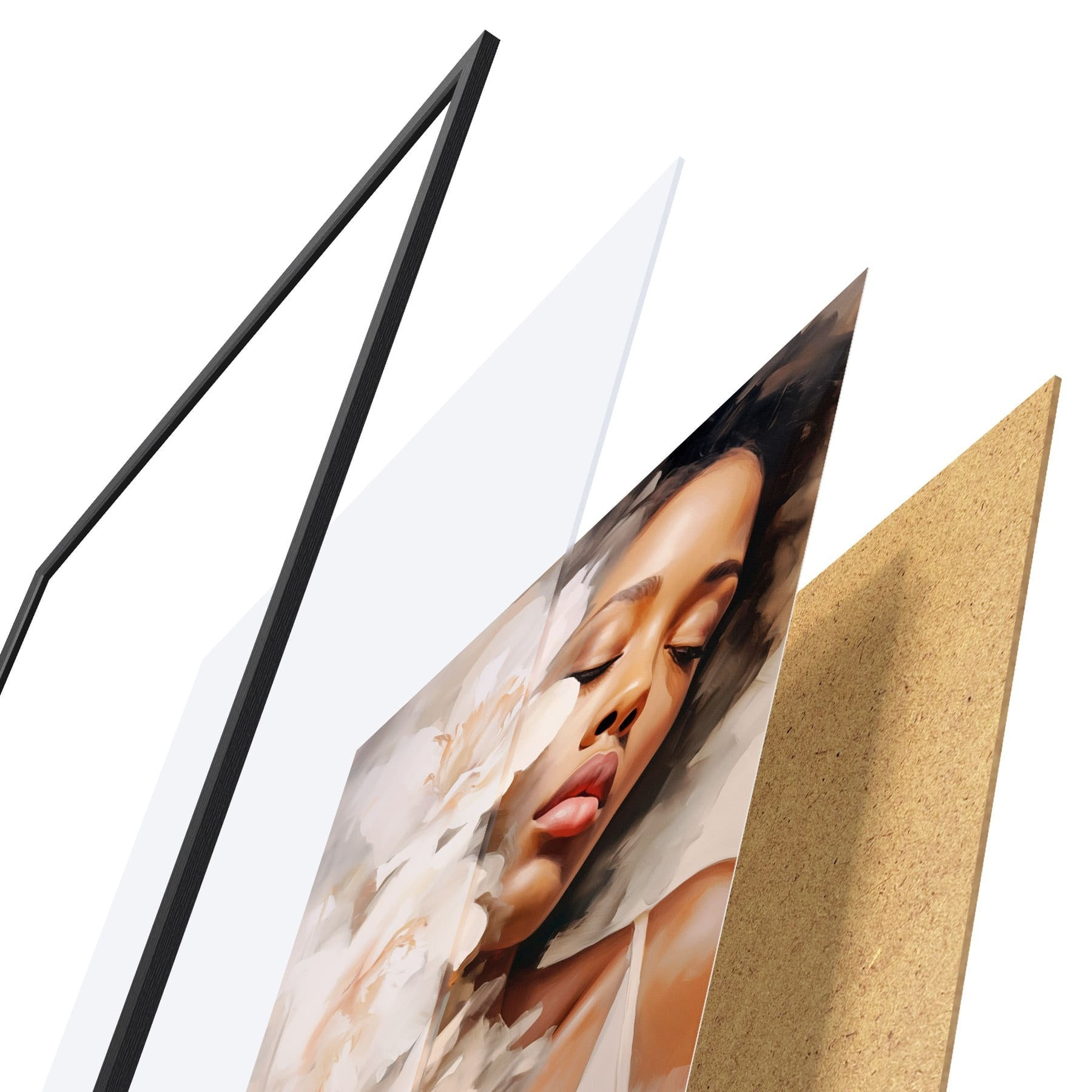 De poster bestaat uit een frame, plexiglas, geprinte afbeelding en spaanplaat achterkant. De poster kan meteen aan de muur worden gehangen dankzij de bevestigingen op de achterkant.