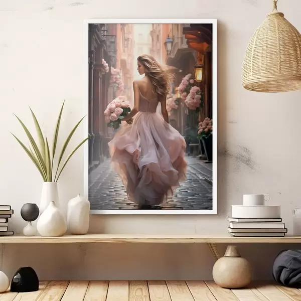 Poster Vrouw in een roze jurk loopt over straat N° f47316