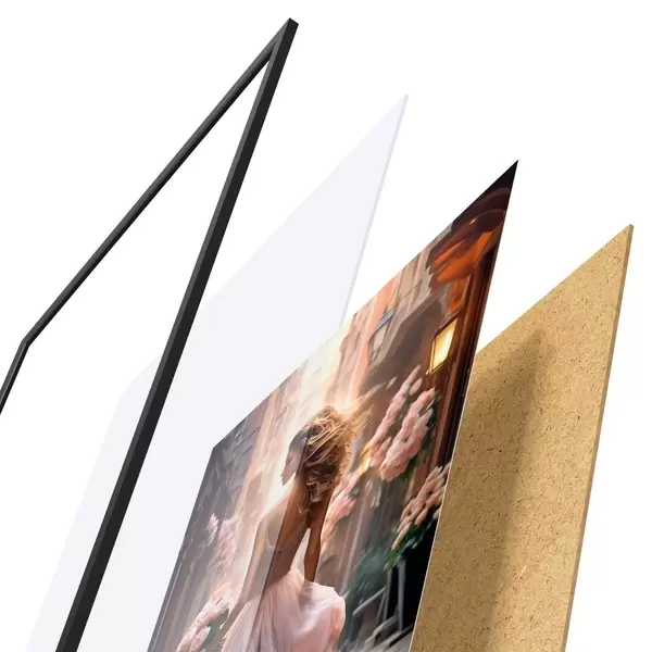 De poster bestaat uit een frame, plexiglas, geprinte afbeelding en spaanplaat achterkant. De poster kan meteen aan de muur worden gehangen dankzij de bevestigingen op de achterkant.