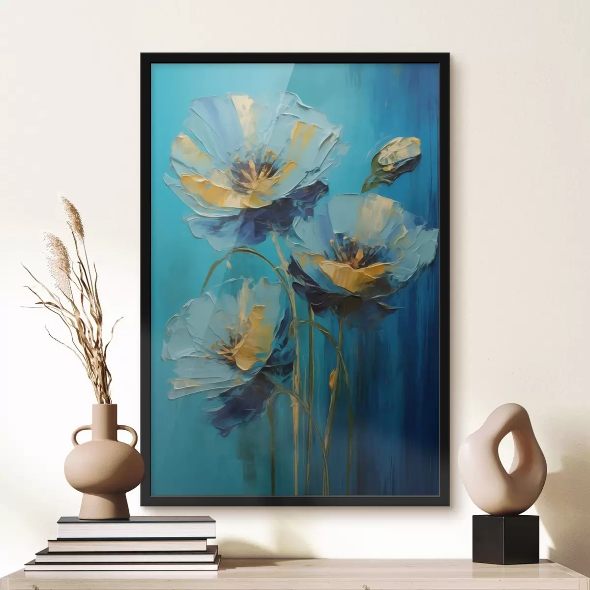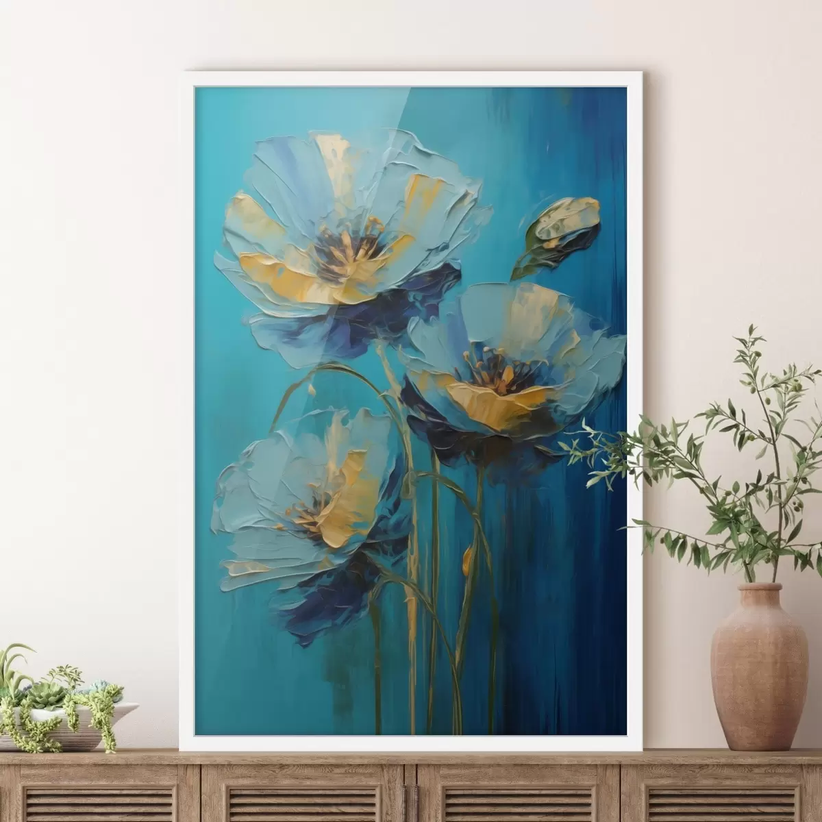 Poster Blauwe bloemen op een levendige achtergrond f47324