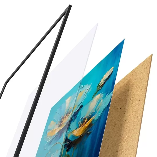 De poster bestaat uit een frame, plexiglas, geprinte afbeelding en spaanplaat achterkant. De poster kan meteen aan de muur worden gehangen dankzij de bevestigingen op de achterkant.