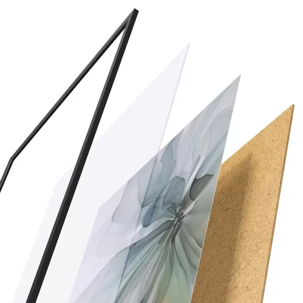 De poster bestaat uit een frame, plexiglas, geprinte afbeelding en spaanplaat achterkant. De poster kan meteen aan de muur worden gehangen dankzij de bevestigingen op de achterkant.